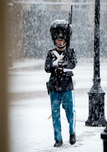 Pas étonnant que la neige soit tombée partout de toute l’Europe du Nord …même en France ..Un temps à ne pas rester dehors trop longtemps et je plains le pauvre garde …il n’a même pas de bottes !!!